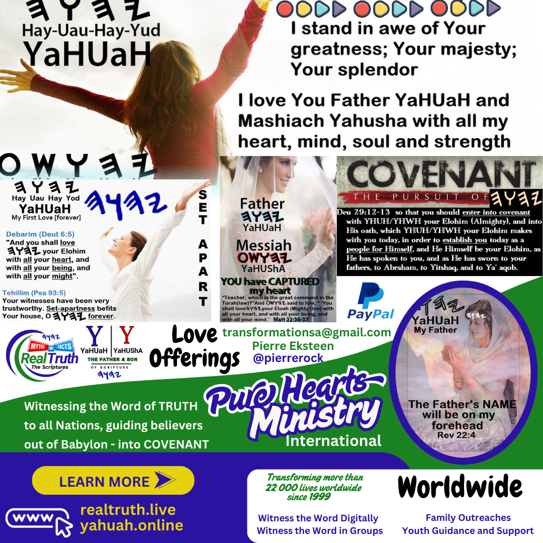 I firmly believe that you have been led to this website, enabling you to DIVORCE Babylon and all her abominations, allowing you to enter into COVENANT with Almighty Father יהוה YHUH.